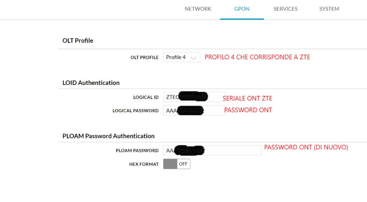 Ciao piccolo aggiornamento circa qua sopra. Ho correttamente sostituito l'ONT ZTE di OF con un Ubiquiti Ufiber Loco. Non il Nano-G che differisce solo per la parte schermo oled di cui non ero interessato, a circa la metà del prezzo. Durante l'installazione della linea ho sbirciato il tecnico e sono riuscito a copiarmi la password ONT. Per chi l'avesse, semplicemente può impostare come qua sotto: Accedere alla management dell ONT Ubiquiti sulla 192.168.1.1 con ubnt/ubnt, spostarsi sulla scheda GPON, compilare i campi sotto indicati e riavviare il dispositivo