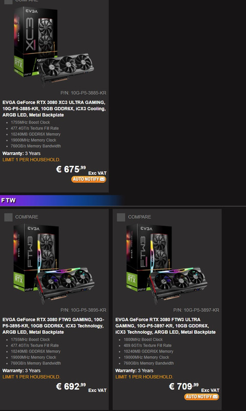 Io personalmente compro, monto, uso e stop per le VGA. Solo sulla CPU posso fare un po' di OC. Su Amazon per ora comunque si trovano solo XC3 e FTW3 praticamente, il resto delle marche sono fantasma. Vediamo giovedì prossimo anche se io sono più orientato sulla 3090 o 3080Ti (che non si sa se esista) perché poi me la voglio tenere 3 o 4 anni almeno che non incorra nei limiti prima del tempo, così al massimo cambierò con qualche refresh di hopper o addirittura qualcosa di successivo. In genere faccio una gen si e una no.