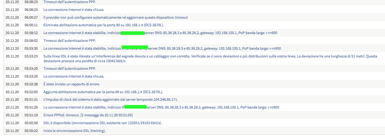 Dallo stralcio di log che hai allegato mi pare di capire che salti solo la connessione PPP, in quanto vedo che viene negoziata più volte, mentre la connessione DSL rimane in piedi (o almeno non cade così spesso). Per questo ipotizzo un tuo apparato che tenta di stabilire lui una connessione col provider. Altra possibilità è qualche corto circuito tra il cavo del telefono e qualcosa che va alla cam, magari i due cavi si intrecciano tra loro in canalina Ma probabilmente in quel caso cadrebbe sempre anche la connessione DSL. Non conoscendo casa tua vado per ipotesi, magari estreme, ma mi pare che giusto cose strane sian rimaste da analizzare. Tra queste anche il fatto che la cam cerchi di aprire sul router la porta TCP 80, normalmente riservata alle connessioni HTTP. La tua storia mi ricorda quella che capitò numerosi anni fa ad un amico che aveva un'officina, quando gli si presentò una signora che lamentava il fatto che se camminava in retromarcia e suonava il clacson la macchina si spegneva ...uscirono matti per trovare il problema...