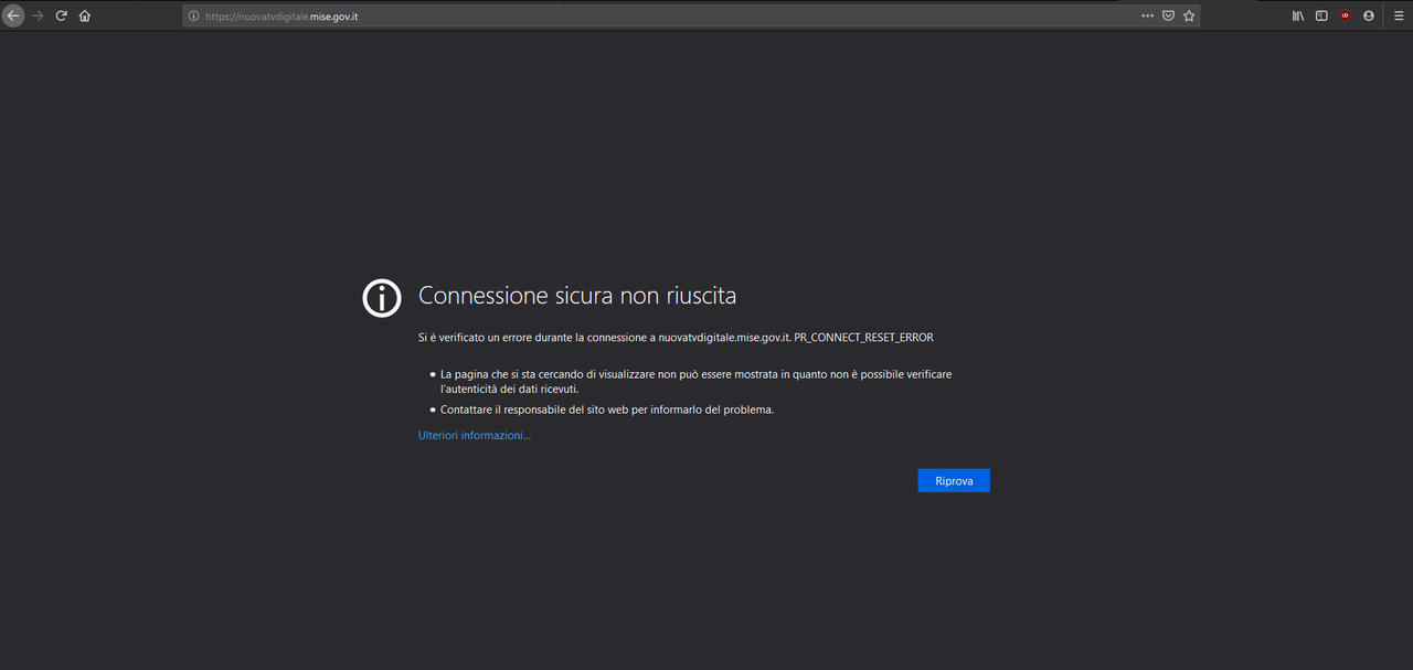 confermo Connessione sicura non riuscita Si è verificato un errore durante la connessione a nuovatvdigitale.mise.gov.it. PR_CONNECT_RESET_ERROR La pagina che si sta cercando di visualizzare non può essere mostrata in quanto non è possibile verificare l’autenticità dei dati ricevuti. Contattare il responsabile del sito web per informarlo del problema. Ulteriori informazioni… |