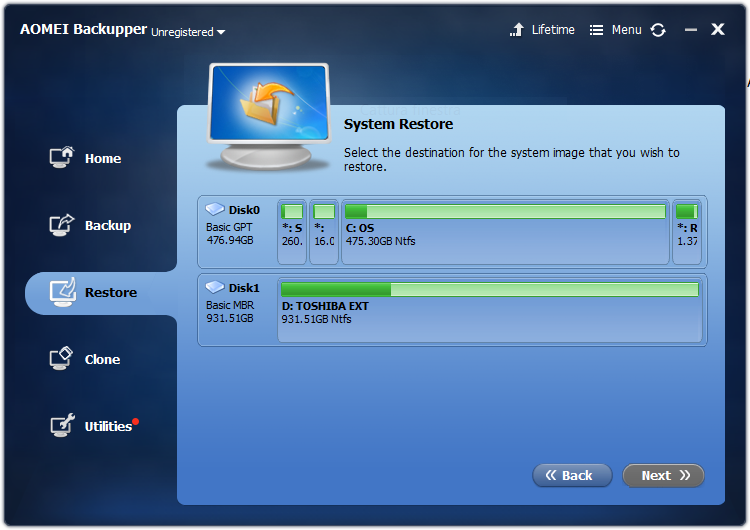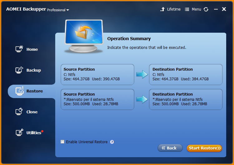 Nel primo caso, la scelta è automatica poiché il programma ha riconosciuto il sistema da cui era stata ottenuta l'immagine di backup. Nel secondo caso, sei tu a dover scegliere una partizione dove appunto verranno ricreate le partizioni presenti nell'immagine di backup, nel tuo caso due partizioni cioè la C e quella riservata per il sistema. Ricordati che la partizione che scegli come destinazione sarà cancellata per ricreare le partizioni dell'immagine. Se non hai una partizione libera puoi usare un programma di partizionamento per crearne una nuova, ad es. AOMEI Partition Assistant Standard oppure MiniTool Partition Wizard free, ecc. |