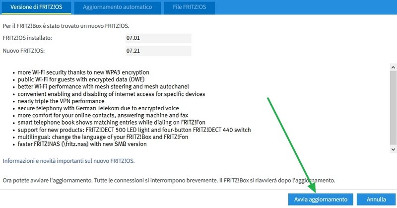Quindi...per ricapitolare : 1) Eseguo un backup del Fritz!Box da questa schermata [IMG] [/IMG]2) Fatto questo aggiorno il mio OS 7.01 da questa sezione (viene scaricata da qui la versione "labor" a cui accenni...? [IMG] [/IMG]3) Qualora si presentassero problemi effettuo il ripristino da qui [IMG] [/IMG]Scusate se chiedo conferma ma...come già detto..vorrei evitare nel modo più assoluto di fare pasticci... :-) Grazie ancora Ultima modifica di Alebit : 03-12-2020 alle 18:39. |