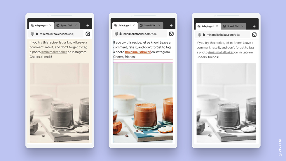 -------------------------------------------------------------------------------------------------------------------------------------------------------------------------------------------------- 04/02/2021 Vivaldi introduces Page Actions: Change the look of web pages on Android Pagine web personalizzabili, uno scanner QR integrato, Selezioni rapide migliorati e supporto per i gestori di download esterni arrivano in Vivaldi per Android e Chromebooks. ![]() Alcune persone non riescono a smettere di modificare le cose. Con l'ultima versione di Vivaldi per Android, rabberciature e piccoli aggiustamenti possono cambiare l'aspetto di qualsiasi pagina Web visitata. Per alcuni, può migliorare l'accessibilità, la leggibilità o il modo in cui interagiscono con le pagine Web. Per altri, sarebbe solo per il gusto di farlo. Il primo aggiornamento del 2021 introduce Azioni sulla pagina, una funzione che permette di impostare filtri e azioni predefinite per modificare l'aspetto di qualsiasi pagina web. Le azioni sulla pagina migliorano l'accessibilità, rendono i siti web più facili da leggere e, in generale, visualizzano le pagine web nel modo desiderato. La nuova versione Vivaldi 3.6 include anche uno scanner di codici QR incorporato e i Gestori di download esterni. Aggiunge Selezioni rapide di medie dimensioni alla serie di layout delle Selezioni rapide e rende possibile l'ordinamento delle stesse secondo diversi criteri. Vi invitiamo a divertirvi con la nostra enorme libreria di impostazioni con cui potete giocare e modificare. Con ogni aggiornamento, Vivaldi per Android mira a diventare più personalizzabile e facile da usare. Vivaldi può essere scaricato gratuitamente su cellulari e tablet con Android 5 o versioni successive e su Chromebook aggiornati. Non sei contento di come appare una pagina web? Vai avanti e aggiustala Video ordinamento Note L'interfaccia utente flessibile di Vivaldi include una barra degli indirizzi mobile, una barra delle schede, schede reali (in stile desktop), e molto altro ancora che ti permette di ottimizzare la tua navigazione su Android. Questo non è chiaramente sufficiente. Ora Vivaldi apre una nuova gamma di opzioni, azioni, gradi di colore ed effetti per le pagine web che possono essere scelti da una lista pop-up di Azioni sulla pagina - tutto senza lasciare il browser. Simile alla versione del browser desktop, Azioni sulla pagina ha una serie di opzioni - leggibilità, debugger CSS, effetto colore seppia, filtro in scala di grigi e altre - che possono essere combinate per personalizzare l'aspetto della pagina web visualizzata. Più di un'azione può essere applicata a una singola scheda, con combinazioni che si adattano perfettamente alle esigenze degli utenti. ![]() Migliorando l'accessibilità e la leggibilità, le Azioni sulla pagina non determinano solo l'aspetto di una pagina web, ma come si interagisce con essa. Per esempio, è possibile visualizzare ogni immagine su una pagina in modo inclinato o cambiare tutti i caratteri in monospazio o anche sostituire i colori con filtri tipo Instagram. Ci sono opzioni per cambiare il colore dello sfondo (seppia o un tema scuro), per sfocare fotograficamente gli elementi dello schermo con cui non state interagendo e la possibilità di trasformare persino il browser in un finto oggetto 3D. ![]() Inoltre, l'azione Debugger CSS può aiutare i progettisti di pagine web. Le immagini possono essere inclinate e trasformate su una pagina aperta. Applicate questi effetti e trasformazioni a una pagina selezionando il gruppo "Azioni sulla pagina" nel menu principale di Vivaldi. Uno scanner di codici QR, ora in Vivaldi ![]() L'abbiamo visto tutti, la pandemia ha inaugurato un mondo senza tocco. Di conseguenza, i codici QR (risposta rapida) sono saliti alla ribalta. Recentemente, per facilitare la tua navigazione, abbiamo introdotto un generatore di codici QR integrato nella nostra versione desktop. Ora abbiamo lo scanner di codici QR su Android. Quando scansioni un codice QR con il tuo telefono, andrai direttamente a una pagina web, un menu, una schermata di pagamento, un'app o offrirai informazioni specifiche uniche per il codice. Il codice QR fornisce le informazioni istantaneamente senza digitare l'URL sul tuo dispositivo. Gestiamo anche QR e codici a barre non-URL che rendono lo scanner più utile quando si copia il codice scansionato negli appunti e anche durante la ricerca. Ci sono tre modi per lanciare la funzione - dal campo URL, attraverso il widget di ricerca, o la scorciatoia dell'app (pressione lunga sull'icona dell'app). Scegliete sempre l'opzione "media"? Prendete le vostre Selezioni rapide in formato medio e ordinatele Le Selezioni rapide nella pagina iniziale ti permettono di accedere ai tuoi siti preferiti e di organizzare i segnalibri più rapidamente. Recentemente, abbiamo aggiunto una varietà di layout alla Pagina iniziale con Selezioni rapide grandi, Selezioni rapide piccole e Selezioni rapide in lista. Ci siamo resi conto che ci sono alcuni che preferiscono le Selezioni rapide di medie dimensioni. Per questo motivo abbiamo aggiunto questa nuova opzione al layout esistente per voi da poter visualizzare e scegliere. Andate in "Impostazioni - Pagina iniziale - Selezioni rapide medie" e seleziona la vista preferita della pagina iniziale. Abbiamo lavorato per migliorare l'esperienza di utilizzo delle Selezioni rapide per voi. Noterete che le Selezioni rapide grandi sono visivamente migliori di prima grazie alle miniature aggiornate. Proprio come le caratteristiche di Vivaldi, Note e Segnalibri possono essere ordinate, le Selezioni rapide possono ora essere ordinate per titolo, indirizzo, scorciatoia, descrizione e data secondo le preferenze individuali - aiutandovi a navigare e accedere rapidamente ai vostri siti preferiti. Download più facile con gestori di download esterni ![]() Ti affidi al tuo browser per accedere a molte risorse disponibili online. A volte, per questo, potrebbe essere necessario un ges