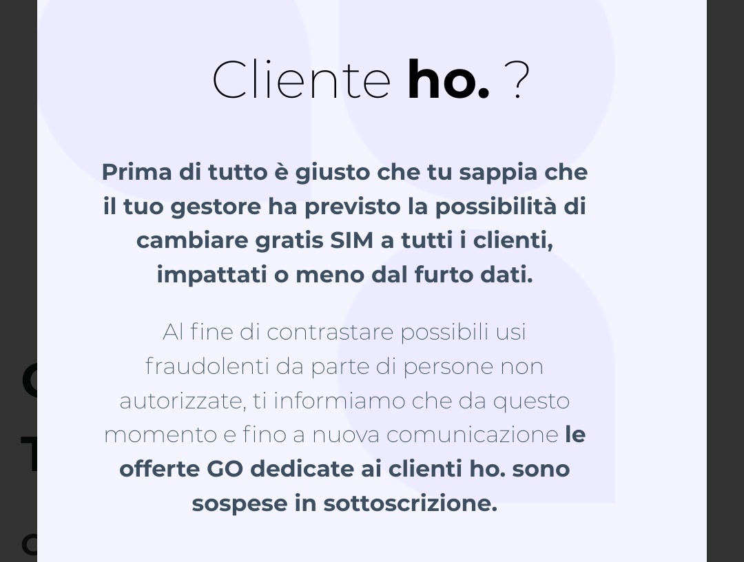 Qui si scatenano troppo spesso buriane senza aver conoscenza del fatto. Anno hackerato un database di HO, HO ha denunciato il fatto e avvertito i clienti interessati garantendo un cambio sim gratuito. PUNTO. Qualunque altro operatore avrebbe fatto lo stesso, ora i concorrenti aumentano le tariffe verso gli utenti HO che chiedono portabilità perchè impanicati e disposti a pagare pur di andarsene. Nessuna novità all’orizzonte Io con le mie 4 sim a 5,99 x 70 Giga me ne sta a guardare in riva al fiume. La faccenda comunque è positiva in quanto pone l'attenzione verso la privacy e aiuterà la clientela ad essere più accorta. Cambiare operatore e continuare ad usare la stessa mail e la stessa password e le autentificazioni tramite SMS significa non aver capito l'accaduto.