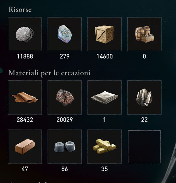 Per fare un esempio, nel mio attuale inventario: - titanio > 15 - ferro > 12970 - cuoio > 19490 Però, ripeto, il titanio è rigenerato nel mondo di gioco e, volendo, costa solo 30 monete d'argento (in rapporto cuoio e ferro costano 1 moneta). |