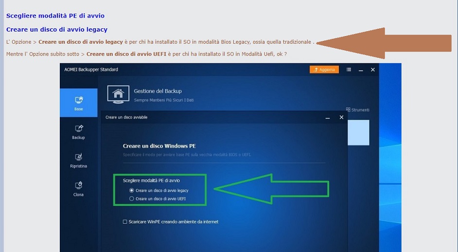 Ho effettuato un back up di sistema e ora debbo creare una chiavetta avviabile ma non capisco perchè alla richiesta "Scegliere la modalità PE di avvio" debbo selezionare ,secondo la guida del buon Tallines ,da "creare un disco di avvio legacy" e non come "creare un disco di avvio "UEFI". Posseggo Windows 10 PRO ovviamente in modalità UEFI. Grazie |