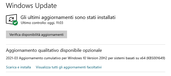 ho Windows 10 1909. Qualche giorn fa mi ha installato gli ultimi update e mi e' comparso anche per la priva volta un'iconcina in basso a destra (a sinistra dell'orologio) che mi diceva di aggiornare a una piu' recente build perche' il supporto a questa sta per finire. Ora, quando vado in Windows Update e faccio Verifica disponibilita' aggiornamenti, va via il tasto Verifica disponibilita' aggiornament, non compare piu' la scritta di sistema aggiornato (o non sono disponibili nuovi aggiornamenti) e mi ritorna la scritta Verifica disponibilita' aggiornamenti. Perche' non mi da' gli aggiornamenti in automatico? Ho qualche incompatibilita' di sistema? Ho un Intel i5 2500k, 4GB RAM e niente scheda video o altre schede. Grazie |