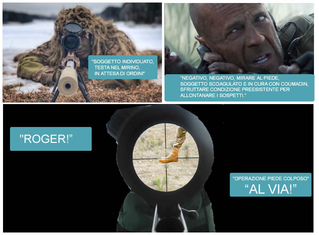![]() Cecchino: "soggetto individuato, testa nel mirino, in attesa di ordini" Comando: "Negativo, negativo, mirare al piede, soggetto scoagulato e in cura con Coumadin, sfruttare condizione preesistente per allontanare i sospetti." Cecchino:"Operazione piede colposo al via!" ![]() Quote: