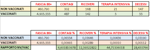 Si sono trovate più persone infette tra i vaccinati , ma in una popolazione 10 volte superiore rispetto ai non vaccinati. Quindi in realtà il valore percentuale corretto soppesato sulla popolazione non è del 57,5%, ma dello 0,009%. Ora... prendiamo i dati basandoci sui contagi. I vaccinati over 80 sono principalmente asintomatici/pauci-sintomatici/sintomi lievi con una percentuale del 58,52% (285 su 487), poi necessitano di un ricovero nel 29,16% dei casi (142 su 487), nell'1,03% dei casi sono andati in terapia intensiva (5 su 487) e nel 11,29% dei casi sono deceduti (55 su 487) ASINTOMATICI/PAUCI-SINTOMATICI/LIEVI: 58,52% RICOVERI: 29,16% TERAPIA INTENSIVA: 1,03% DECESSI: 11,29% I non vaccinati over80 principalmente vanno in ospedale oppure muoiono (le percentuali non le posso mettere perchè non tornano... evidentemente alcune morti o ricoveri sono più vecchie di un mese).