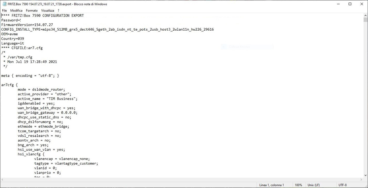 Siccome il file di backup viene prodotto da un OS UNIX/Linux, il carattere di fine linea è solo il LF. Non va usato il programma note di windows per aprirlo, non è in grado di interpretarlo correttamente. |