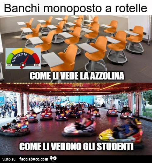 sostituisci a "banchi a rotelle" "vibratori"; l'affermazione rimane vera. porteresti i secondi in classe? ma, anzichè buttarla in caciara come sto facendo... hai mai provato a sederti in uno di quei cosi? io si; non è stata una bella esperienza; e ci sono rimasto il tempo di fare due partite a piante contro zombi, non 5 ore. è vero; io sono un adulto, ma ci sono liceali che mi sovrastano di una spanna buona. ma tralasciando i miei problemi... qualche scuola li ha mai usati? nella mia provincia ti posso assicurare NESSUNA. Ultima modifica di randorama : 01-08-2021 alle 23:56. |