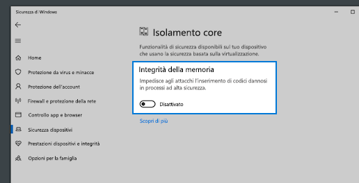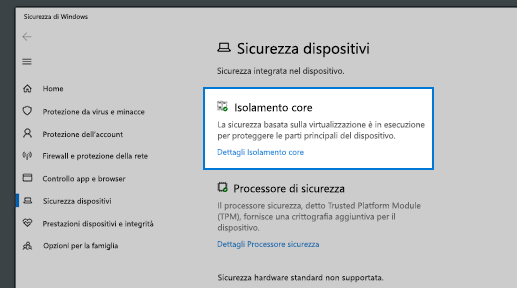 chi avesse un Intel di 11° gen è come fosse localizzato in CINA (vedi il post precedente ):l'hardware sarà anche ok e l'installazione effettuata da 0 ma l'HVCi è "a discrezione" (dell'utente e non di default) (che valga solo x gli OEM??)Integrità della memoria: → https://support.microsoft.com/it-it/...f-3a4c6a61c5e2