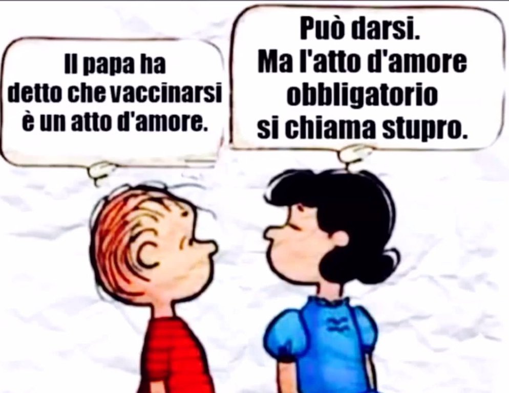 e voler rendere obbligatorio un vaccino sperimentale oltre che eticamente scorretto è anche un grosso rischio che dovrebbe assumersi lo stato, fossi in loro non la prenderei così alla leggera. Anche perchè nei no-vax potrebbero ricadere anche quelli che non vogliono farsi la terza o la quarta dose....e potrebbero essere un altra bella fetta di popolazione. Secondo me hanno già tirato tanto la corda con il GP ...e tira che ti ritira questa corda rischia di spezzarsi. Speriamo che ciò non avvenga...altrimenti altro che qualche no-vax che perde le staffe, qua si rischia la guerra civile.