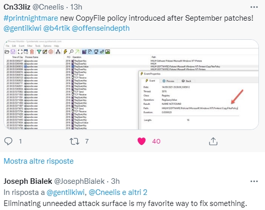 Come? Rimuovendo i riferimenti alla parte di codice legacy... ![]() https://twitter.com/Cneelis/status/1437850037791375362 Microsoft fixes remaining Windows PrintNightmare vulnerabilities |