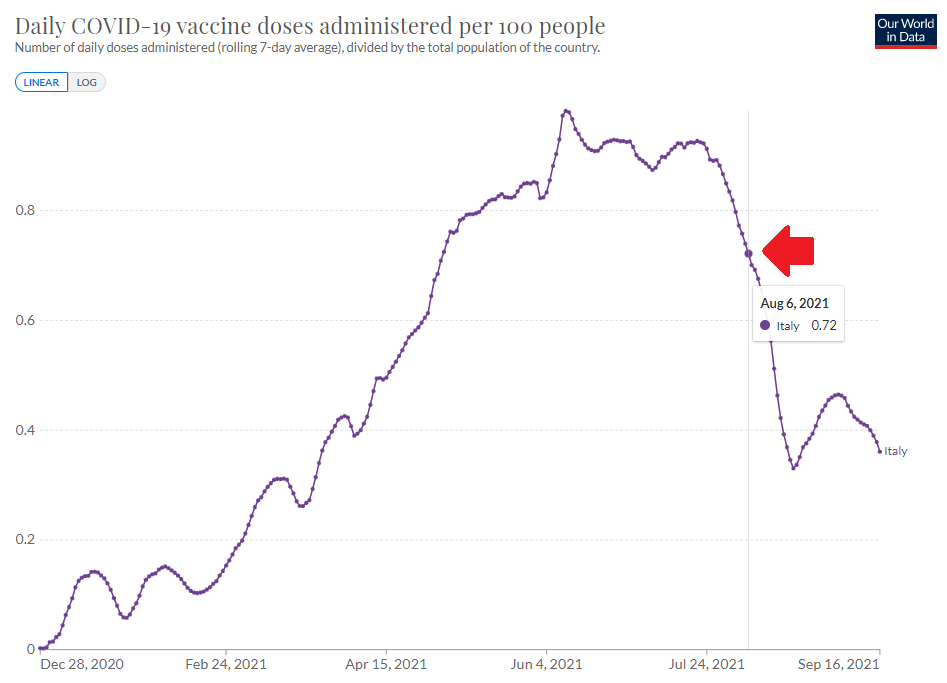 ![]() La freccia indica il giorno in cui è stato introdotto il green pass. Ogni ulteriore commento mi sembra superfluo. |