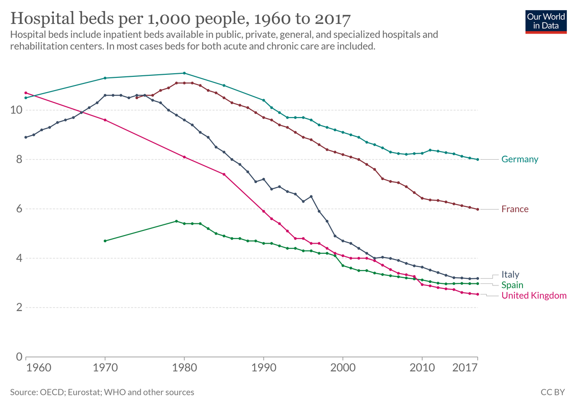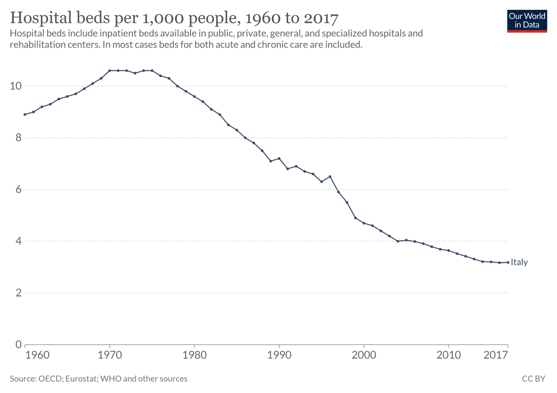 Se hai una nazione con prevalenza di giovani e particolarmente attivi, probabilmente sarà più raro aver necessità di tanti posti letto. In Italia è evidente che sono diminuiti ESCLUSIVAMENTE per ragioni di contenimento dei costi (i famosi tagli orizzontali). Ci sono posti che conosco al Sud, nei quali devi fare diverse decine di km per trovare il primo ospedale... alcuni non hanno neanche il pronto soccorso. In una grande città questo potrebbe non essere un grande dramma... ma in luoghi di montagna impervi, spesso ci vuole anche più di un'ora. Se hai un'emergenza, non è detto che tu possa arrivare in tempo. Ora questo è evidente sia un fenomeno con radici antiche che però ha mostrato tutto il suo dramma proprio adesso durante una pandemia. D'altra parte ti accorgi di avere la coperta corta quando si cerca di stare in più persone in un letto e non quando si è da soli.