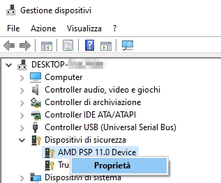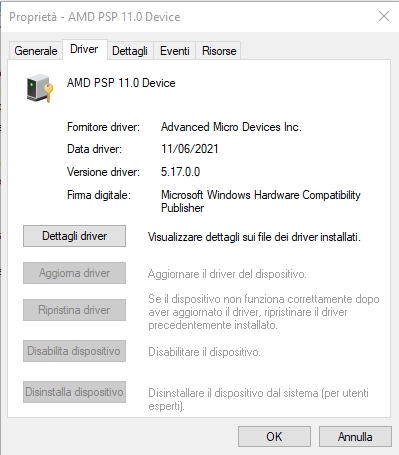 E cmq i problemi specifici tipo questo (che se non erro è attinente a 10 giusto perché è quello l'os in uso altrimenti per il resto non c'incastrerebbe una minchia) andrebbero trattati in un thread a se... Infine, senza farla troppo lunga: se (come credo) siete partiti dal problema del device AMD PSP 11 per il quale (da un po’, in verità) è uscita la versione "corretta" (5.17.0.0), dal tuo screenshot si vede chiaramente che hai la versione vulnerabile (altrimenti non ti proporrebbe proprio la versione in questione)... PS: che sono tutto testa lo si ricava facilmente dal ragionamento sopra , ad ogni modo per conferma sono andato a rivedere da dove è partito il discorso e infatti ...notizia→scatta la paura...e da lì di tutto di più.. PS 2: sempre per non farla troppo lunga, se uno di un dato componente deve vedere qual'è il driver in uso, è sufficiente clicchi su Start con il pulsante DESTRO e vada in Gestione Dispositivi. Da lì, posto di sapere la periferica di interesse (cioè cosa cercare!, in questo caso AMD PSP che è sotto la voce dispositivi di sicurezza), è sufficiente appunto selezionarne la voce, aprirne l'albero e spostarsi sulla linguetta driver, punto.