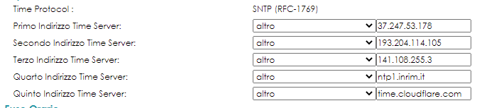 terza volta in una settimana che va via la corrente, che non so cosa stiano combinando in strada. almeno ora sono passato da 126mbps a 143mbps prova a cambiare server NTP, io uso questi [/url]il menu può essere diverso dal mio (ho l'8823 di Tiscali) |