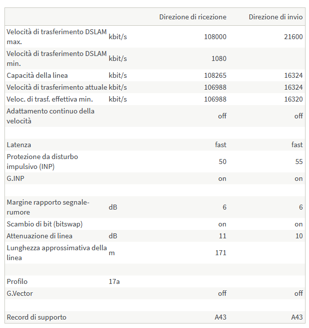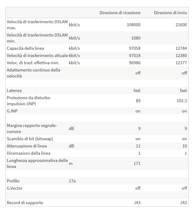 Sono in FTTC 200mbps (profilo 35b) da alcuni anni. Fino a non moltissimo tempo fa la mia linea andava a 200 mbps pieni. L'armadio ripartilinea del resto è letteralmente fuori dal cancello del condominio in cui abito: ![]() Da un po' di tempo ho notato che la velocità si è abbassata nettamente e l'altro giorno ho controllato i dati: ![]() A quanto vedo, output power e line attuation sono praticamente gli stessi (il primo screen è di svariati anni fa), l'unica differenza che noto è un Noise Margin che adesso è sul 6, mentre prima eccedeva anche di diversi db. Il modem non è cambiato, non sono stati toccati i cavi e la presa è sempre la stessa... Possibile che la diafonia si sia mangiata 100 mbps di portante? Non posso caricare hlog per ora, ma sto aspettando un nuovo modem (metto il 7590) ed eventualmente vedrò di postarli. Grazie dell'aiuto :-)