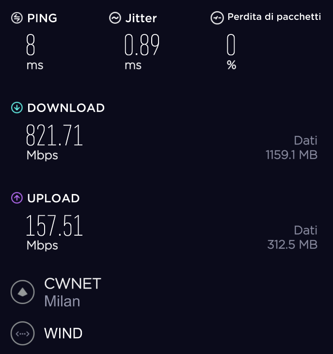 Server: Wind Tre - Milano (id = 27363) ISP: Wind Tre Latency: 7.48 ms (0.22 ms jitter) Download: 774.94 Mbps (data used: 1.3 GB ) Upload: 154.46 Mbps (data used: 204.7 MB ) Packet Loss: 0.0% Result URL: https://www.speedtest.net/result/c/1...c-11373234b7e5 Server: CWNET - Milan (id = 1434) ISP: Wind Tre Latency: 7.83 ms (0.21 ms jitter) Download: 757.59 Mbps (data used: 1.4 GB ) Upload: 160.32 Mbps (data used: 210.8 MB ) Packet Loss: 0.0% Result URL: https://www.speedtest.net/result/c/8...b-e67a08b821ca Server: CDLAN S.R.L. - Milan (id = 8211) ISP: Wind Tre Latency: 8.83 ms (0.08 ms jitter) Download: 816.01 Mbps (data used: 1.4 GB ) Upload: 165.04 Mbps (data used: 226.1 MB ) Packet Loss: 0.0% Result URL: https://www.speedtest.net/result/c/a...c-9cf5b0d1fc80 Stranamente ottengo risultati leggermente migliori con l'app. Gli ultimi due per esempio: ![]()