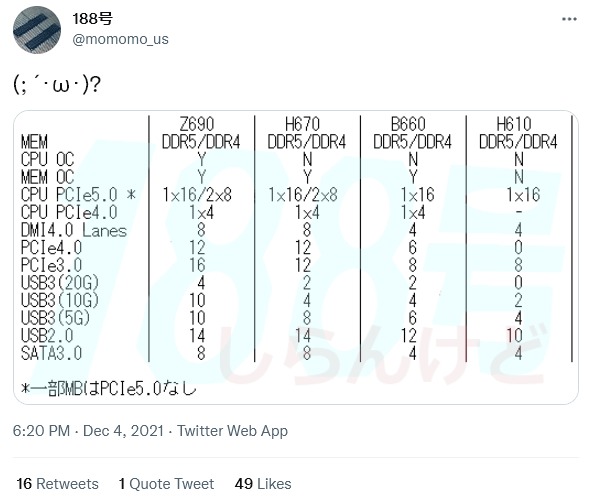 Svelati alcuni dettagli sulle schede madri Intel H670, B660 e H610: https://www.guru3d.com/news-story/h6...cs-leaked.html Nello specifico si parla del fatto che questi chipset (che saranno annunciati al Ces di Las Vegas di gennaio 2022), avranno il supporto alle ram DDR4 e DDR5. Sulle schede madri H610 Intel ha messo una sorta di blocco nell'uso delle memorie oltre i 3200 mhz, mentre le schede madri B660 e H670 (così come ovviamente le Z690) saranno capaci di usare le memorie ram fino al massimo della frequenza che la motherboard stessa permette. Per quanto concerne l'argomento linee PCI-E, sulle schede madri H670 vi sono 16 linee PCIe 5.0 per la cpu, separate in due gruppi da 8, mentre sulle schede madri B660 e H610 vi è un singolo slot PCI-E 5.0 con 16 linee. Sulle schede madri H670 e B660 vi sono 4 linee PCIe 4.0 non presenti sul chip H610. Il chipset H670 è dotato di 12 linee PCI-e 4.0 in aggiunta alle 12 linee PCI-e 3.0 per ssd nvme M.2 e per le porte ethernet ad alta velocità. Il chipset B660 è dotato di 6 linee PCI-e 4.0 in aggiunta alle 8 linee PCI-e 3.0, infine il chipset H610 è dotato solamente di 8 linee PCI-e 3.0 (non presenti, quindi linee PCI-e 4.0). La connessione DMI 4.0 che connette la CPU con il chipset, sulle schede madri B660 e H610 è dotata solamente di 4 linee, fornendo circa la metà della larghezza di banda del chipset H670 che invece è dotato di 8 linee.