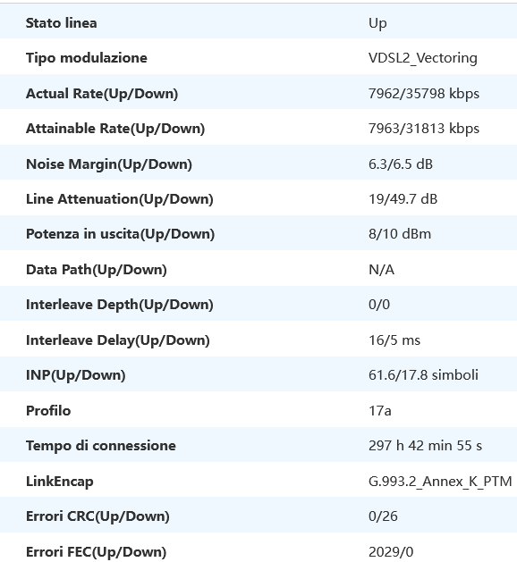 Questi sono i miei valori a 484 metri dall'armadio, Thiesi, SS (notare i valori della connessione, superiori a quelli massimi ottenibili) ![]() Quando me l'hanno attivata 1 anno fa andava a 43/9Mb poi c'è stato un guasto a Maggio, e sono rimasto 8 giorni senza linea, il tecnico che ha controllato l'armadio ha detto che l'armadio era vecchio e aveva quasi tutte le coppie bruciate, ha provato a spostare la mia linea su tutte le coppie disponibili e questo è il massimo che siamo riusciti a ottenere. Da quello che ho visto, la ditta che ha fatto i lavori (non li ha fatti la TIM ma una ditta in sub-appalto, Tecta Srl. di Teramo) ha portato la fibra fino a tutti gli armadi pre-esistenti, ma non è stato aggiunto nessun nuovo armadio per connettere come si deve le "nuove" zone periferiche che si sono espanse negli ultimi 30 anni, e cosi paradossalmente, nel centro storico, mezzo disabitato o abitato da anziani, se sei vicino all'armadio puoi navigare alla portante massima, 108Mb, se invece abiti in "periferia" sei un privilegiato se vai oltre i 40Mb, ho visto anche gente che con la FTTC andava a 15Mb (a 550 metri dall'armadio) o addirittura a 6Mb a meno di 200 metri dall'armadio, li forse per problemi di impianto casalingo.