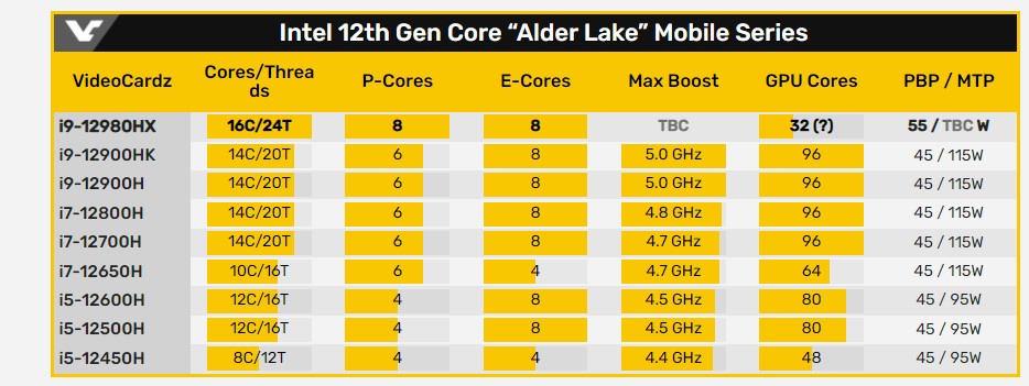 Rumor parlano dell'uscita, per i sistemi mobile, dei processori i9-12980HX / 12990HX (AlderLake-HX) per i vari distributori, cpu dotate di 8+8 core, per un totale di 16 core (8 P-Core e 8 E-core) e 24 thread.