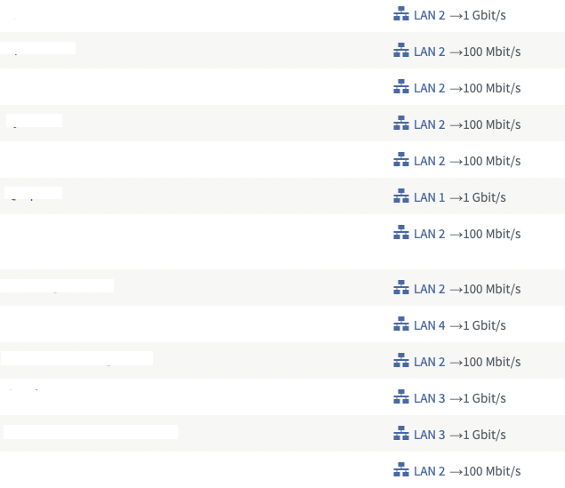 Ci sono alcuni prodotti che pur avendo la scheda lan a 1000 (e correttamente impostato nei fritz di andare a 1000) shiftano in automatico a 100 mb! giusto per farvi capire, scusate l'eccesso di zelo per la privacy : Se riavvio i router tutti i dispostivi vanno a 1 GB e poi dopo 5 minuti si settano a 100mb, così senza toccar nulla. Avete qualche idea pls? PS: abbiamo cambiato tutti gli switch (sono nuovi di palla e testati su ogni porta) e cambiato il cavo (anche questo testato) ![]()