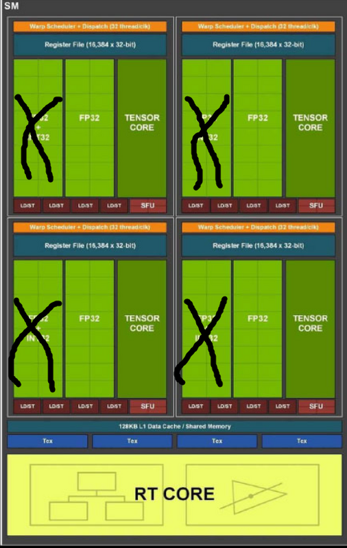 Turing può fare 4608 fp + 4608 INT Ampere fa 5376 fp32 + 5376 FP o INT, in gaming ti verrebbe questo. Paintizzo velocemente ![]() Se gli interi vengono scorporati, es Hopper a 32cc, la situazione cambia non poco: ![]() Il warp (senza dispatch è un mezzo schifo) può fare entrambe le cose, con relative latenze. Se prendiamo AMD ha: 4096 st: navi 33- like navi 21 6900 8192 st: navi 32 12288 st: navi 31 Ora se AMD con soli 4096 st è in grado di prendere l'ammiraglia 7nm con 1/3 delle ALU a 230watt, significa che altrettanto farà nvidia. 7900xt/12288st =4090= 16128cc 7800xt/8196st = 4080/ti 10752 In entrambi i chip c'è il 50% esatto di ALU/BW. La 7700xt è da 4096st, ovvero la metà della 7800xt, con bus a 128bit e 6nm, quindi probabile meno clock. La metà di 10752 è 5376cc in ambito nvidia. Quindi, o sono sbagliati i rapporti, o nvidia potrebbe prendere GA102 top, già da chip di fascia molto bassa. ..... I rumors danno la 4070 pari alla 7700xt, ma partendo da 7680cc, verrebbe fuori che per pareggiare AMD servirebbero 23 k cc.