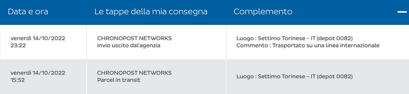 A proposito di corrieri ho usato la chat automatica di chronopost per sapere come mai il pacco spedito giovedì non fosse arrivato ancora a Torino come altre volte e come ad altri. Non sono riuscito a saperlo ma il bot mi ha detto che la data prevista di consegna è martedì e non lunedì come auspicato