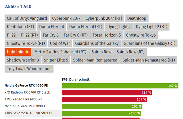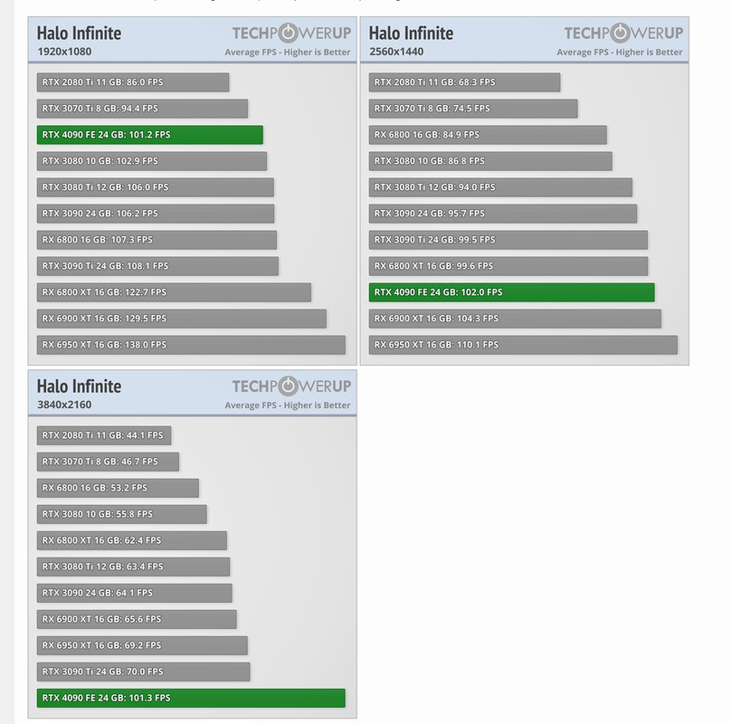 quella review è stata fatta con driver 521.90 Press Driver qualche giorno fa sono usciti i driver 522.25 "Halo Infinite mostra anche un aumento delle prestazioni del 15 percento in WQHD, che diminuisce all’aumentare del limite della GPU." https://www.gamingdeputy.com/it/gami...o-di-rtx-4090/ non so come vanno questi driver nuovi se cambia effettivamente qualche cosa ( anche sulle vecchie 30x0 visto che interessa anche loro ) ma guardando quelle tabelle a me sembra che il problema non sia la 4090 che scala male a livello assoluto, ma il game engine che intono ai 100 fps con le nVidia lavora male in generale, perchè anche la 3080Ti 3090 e 3090Ti sono praticamente attaccate e non scalano.
