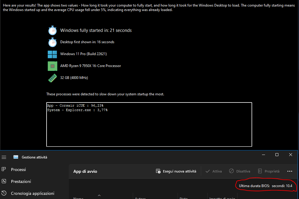 Finalmente sono riuscito ad effettuare un test preliminare con ASUS ROG Strix X670E-F Gaming WiFi e G.Skill Flare X5 32GB Kit DDR5-6000 CL32 (F5-6000J3238F16GX2-FX5) senza scheda video per il momento sono ancora in attesa. Che dire, soddisfattissimo il primo boot mi aspettavo un tempo sui 100 secondi di verifica RAM, invece è stato rapidissimo 40, rispetto alla Tuf che ho castrato non è stato cosi rapido, non so spiegarmelo. Ho effettuato anche l'upgrade dalla versione 705 alla 805 del bios e i riavvi successivi ho rilevato il boot in circa 10 secondi e Windows in 20. Questo è lo screen tramite startup Timer, per me è ottimo sono soddisfatto e non mi interessa secondo più o secondo meno o pretendere di accenderlo come se fosse una lampada, poi farò test per le reali applicazioni che mi interessano per sfruttare questo magnifico processore.