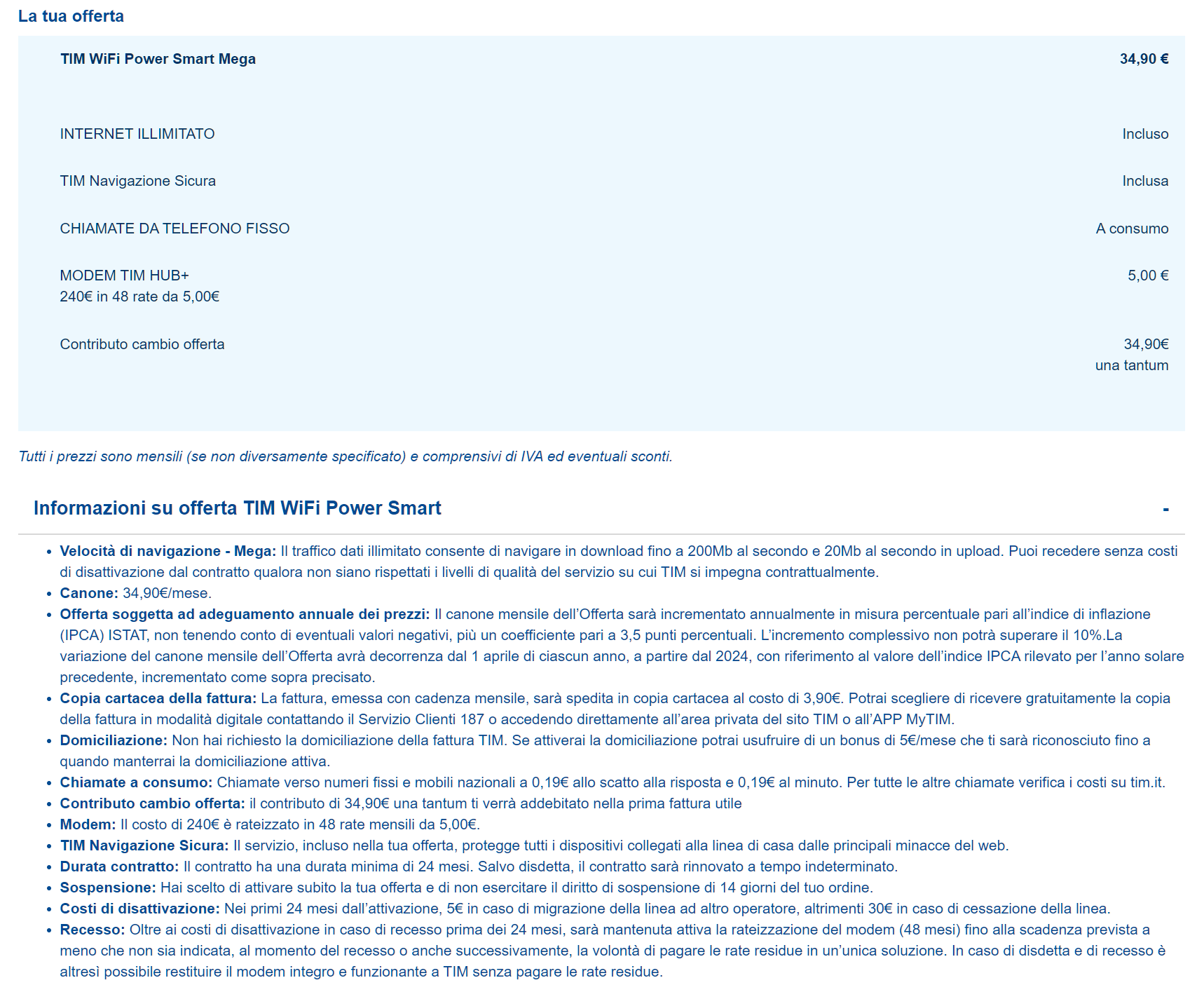 35euro al mese, con modem incluso (ho richiesto la possibilità di non avere il modem, ma non è stato possibile). Meglio dei 55 che pago adesso... Dalla email riepilogativa che mi hanno mandato però, l'offerta mi sembra leggermente diversa da quello che mi aveva fatto capire l'operatore: 35euro al mese 5 euro al mese per 48 mesi per il modem (sbaglio, o questi 5euro sono in aggiunta ai 35?) 35euro per contributo una tantum Ho tempo 48ore per accettare o meno, ma non mi sembra il massimo. Più che altro vorrei capire se quei 5euro del modem sono in aggiunta ai 35 oppure no.