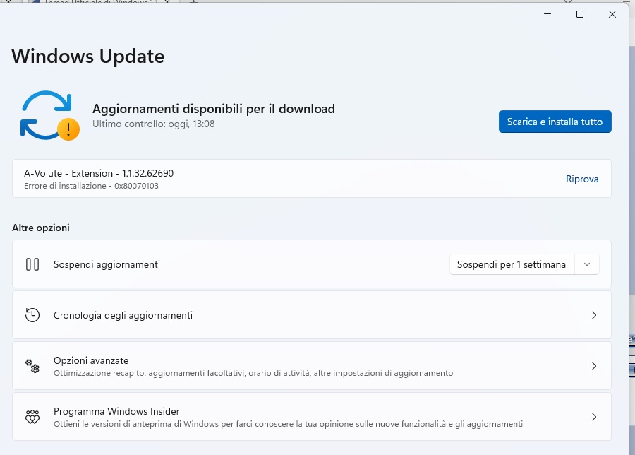 Su 4 PC che ho a casa (2 miei e 2 di mia moglie), tutti e 4 con con lo stesso errore 0x80070103 nell'aggiornamento di vari driver. E devo ancora accendere il 5° (il fisso). Vedo però che se ne parla un po' ovunque, quindi qualcosa dev'essere andato storto a questo giro di W.U. (sui forum MS si fa l'ipotesi che W.U. starebbe tentando di installare driver già installati).