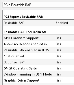 per il rebar puoi controllare anche con gpuz nella sezione ''advanced'' - e poi seleziona ''pcie resizable bar''.