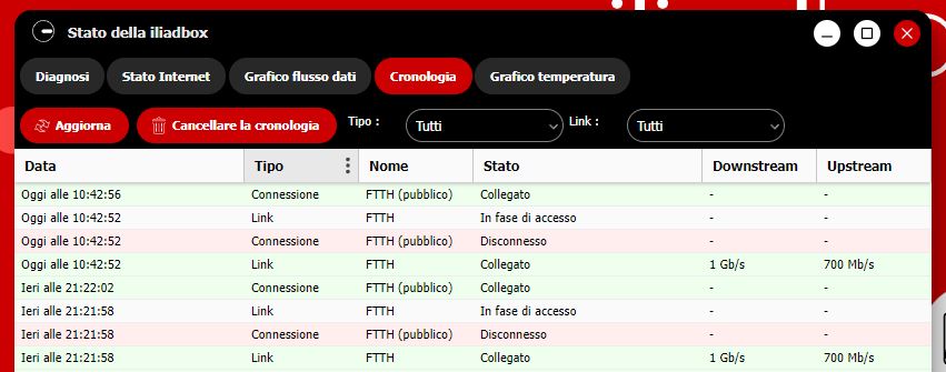 Oltre a quanto già segnalato, nei log delle disconnessioni ora inserisce anche il tentativo di reconnect (parlo della riga bianca IN FASE DI ACCESSO, che prima non appariva): ![]() (NOTA: per errore ho cliccato su uno dei titoli delle colonne e quindi le righe si erano ordinate per quello. Per ripristinare la sequenza logica ho provato a cliccare sul campo DATA ma essendoci secondi uguali in alcuni casi, l'ordine di apparizione delle righe è ora casuale in quei casi, quindi la sequenza logica non appare molto sensata in questo screenshot. Comunque il senso si capisce...) E così già che ci sono segnalo che da me (Milano, 20159) continuano le disconnessioni previ (<5 secondi)