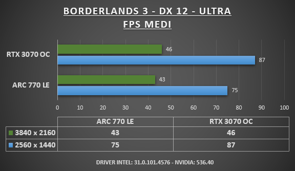 Ho provato ad utilizzare DXVK che converte DX 11 in VULKAN, API che il gioco possiede già di suo tra l'altro, ma su ARC, ed è riconosciuto, non si può attivare. Ho usato l'ultimo driver che tra le note prevede delle correzioni per DX 11 ma, a mio avviso, c'è ancora da fare... Aggiunto il bench di BORDERLANDS 3 - DX 12