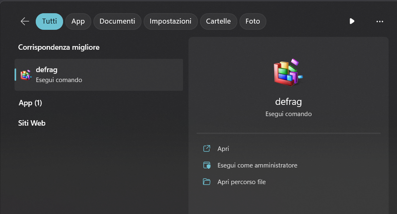 Cerca invece "Deframmenta" e potrai aprire l'app "Deframmenta e ottimizza unità". Credo però che anche con "defrag" tu possa arrivare alla app, cerca però sotto la voce App. |