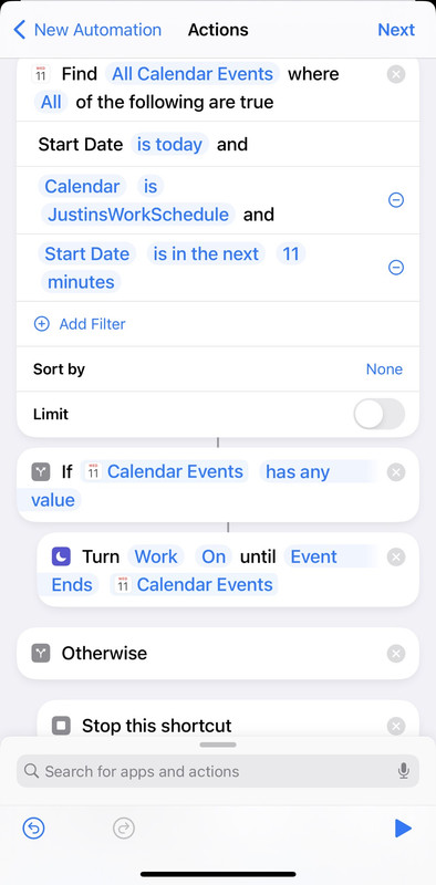 Un utente in un altro forum chiedeva di poter silenziare il telefono, quindi ad esempio attivare una modalità di Full Immersion, durante gli Eventi nel Calendario. Per fare questo, potete farvi un Comando con l'app Comandi Rapidi prendendo spunto dal seguente codice: ![]() ![]() NB. "Data di inizio è nei prossimi 11 minuti" è solo un esempio che vi fa capire che potete filtrare gli eventi del calendario in base alla data o l'ora di inizio, ad esempio potete mettere "Data di inizio è compresa tra ... e ..." e vi fa scegliere anche l'ora. Se non vi interessa filtrare per ora, mettete solo la condizione "Data di inizio è oggi" e così vi trova tutti gli eventi di oggi. Per ogni evento trovato, viene attivata la modalità Full Immersion selezionata fino a quando quell'evento termina Ultima modifica di yeppala : 21-09-2023 alle 17:33. |