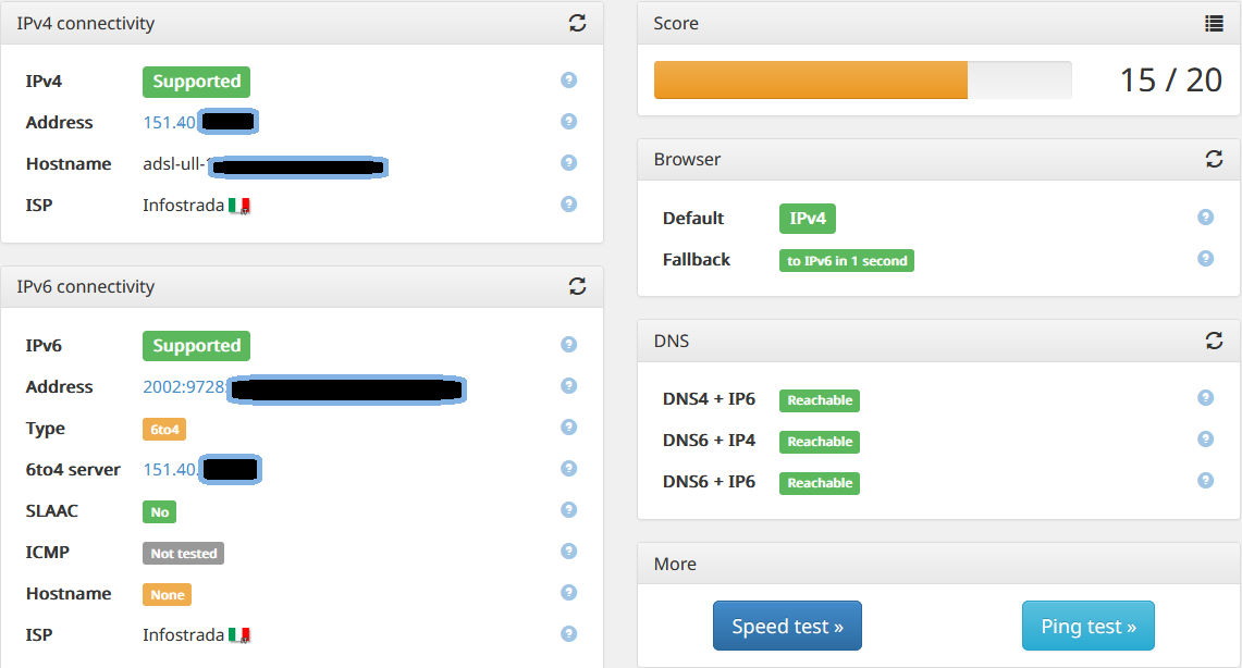Ciao, ho attivato per curiosità il protocollo IPv6 nel Fritzbox 7590 (connesso con l'ONT Huawei dato da WindTre) e dopo aver provato Ipv4 nativo, IPv6 nativo, con IPv6 con tunnelling (opzione 6to4) ha impostato un indirizzo IPv6 e risulta collegato ad Internet.