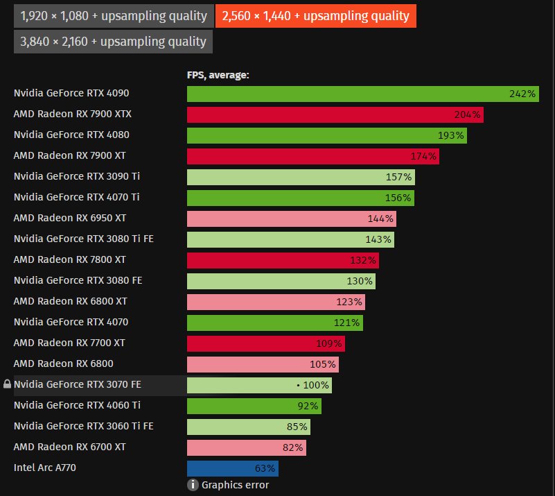 Se le cose andranno peggiorando per il mercato hw penso metterò in standby l'hobby perché: 1- in caso di peggioramenti nei conflitti credo che l'ultimo dei problemi sia l'aumento dei prezzi delle vga; 2- ho anche altri hobby al di fuori del gaming, quindi potrei lasciar perdere per un po' di tempo il PC e spendere i soldi in altre cose dove il rapporto prestazioni/prezzo è più sensato. Qui effettivamente tra pandemia, inflazione, guerre ecc ecc son 4 anni che ogni scusa è buona per alzare i prezzi di qualsiasi prodotto. OT mode on: Infine per concludere col grafico da te postato, in realtà la ARC non va così male, Maury ha fatto alcuni test sul campo con la A770 e la 3070 ed il risultato è stato che la 3070 è più veloce, ma non così tanto da staccare la ARC del 40%, quelle chart son sempre le solite con driver D1 che erano ancora parecchio acerbi e nessuno si è più preso la briga di ritestare tutto a distanza di un anno dall'uscita. Personalmente sto giocando ad Alan Wake II attualmente e con preset alto no RT, a 2560x1440 + FSR quality ci si aggira intorno ai 45 fps nel bosco e sui 70 fps nella metro, a stock, quindi con pl limitato a 190W e non a 228W come riportano tutti, se metto PL max e la porto a 2.65 GHz guadagno altri 5-7 fps. Tutto sommato non è male per una scheda neonata pagata 350€ D1. OT mode off.