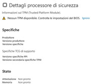 Io anni fa su Windows 10 avevo notato che la scritta di avvertimento "Nessun TPM disponibile. Controlla le impostazioni del BIOS" compariva solo dall'utente Standard NON Amministratore, mentre se ci si loggava come Amministratore veniva riportato lo stato corretto del TPM cioè era solo un problema di visualizzazione su quel pannello con l'utente Standard