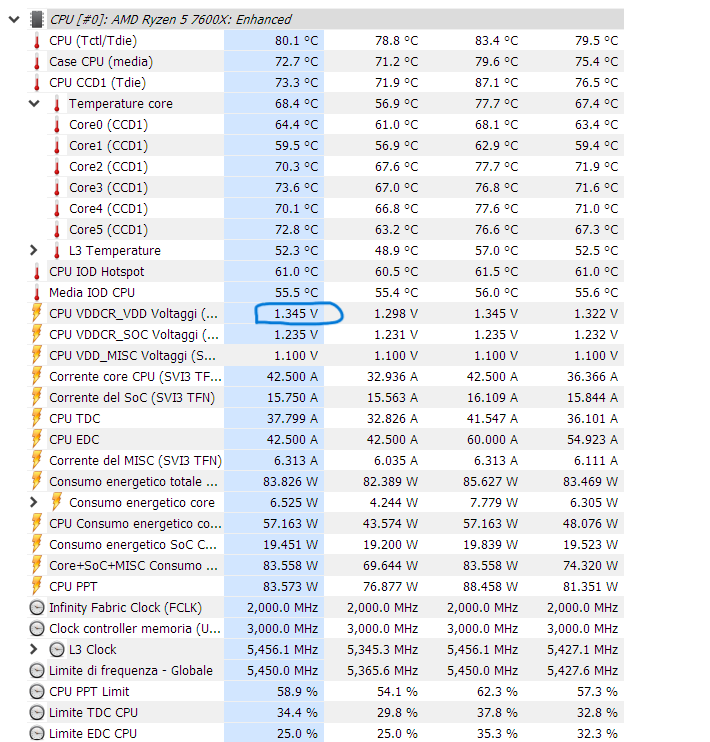 Ho un 7600x con scheda madre Asus x670e TUF Wifi e una Radeon 7900 XT reference, sto usando il PC per giocare ad Hogwarts Legacy in 4k con tutto al massimo praticamente e riesce a mettere il PC abbastanza in crisi. Ho temperature alte sia per la GPU che per la CPU ( in verità ho appena "peggiorato" l'areazione del case mettendo dei filtri antipolvere esterni, che funzionano ma fanno diminuire abbastanza il flusso d'aria in ingresso...), ho notato questo dettaglio però: Ma non doveva esserci il limite a 1.3V con gli ultimi bios per evitare di arrostire i processori? Ultima modifica di Lights_n_roses : 22-01-2024 alle 00:19. |