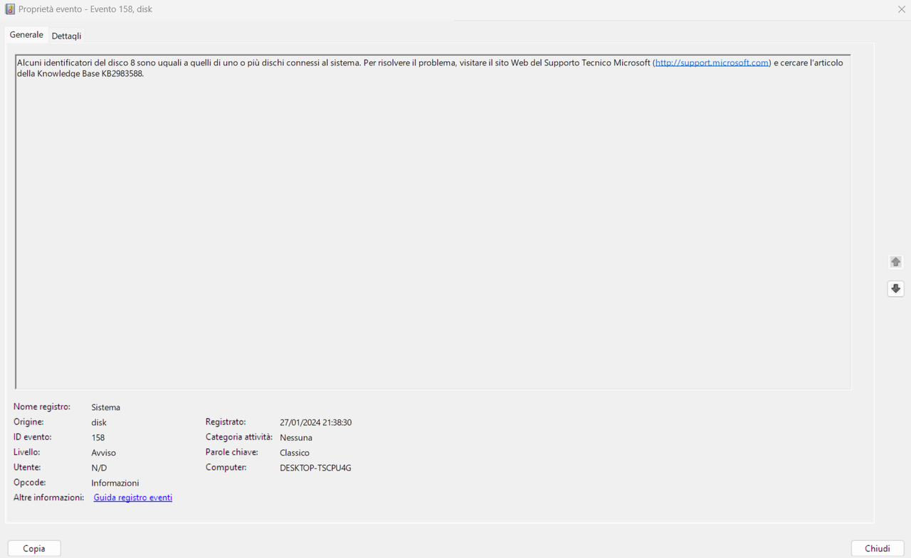 Sono su windows 11 continuo a sentire l'avviso sonoro che di solito si sente quando si connette una nuova periferica, non essendo il caso e sentendolo a volte in continuazione, sono andato a vedere nel registro e ho trovato questo: la situazione dei miei dischi è la seguente: ![]() Per altro il "disco 8" non è un disco ma fa riferimento al pannello frontale con il lettore di memory card. Ho trovato altri errori relativi al disco 5,6,7 ....quindi è il lettore memory card del pannello frontale del case a dare noia? Qualcuno sa darmi una mano? Ultima modifica di Lights_n_roses : 27-01-2024 alle 21:49. |