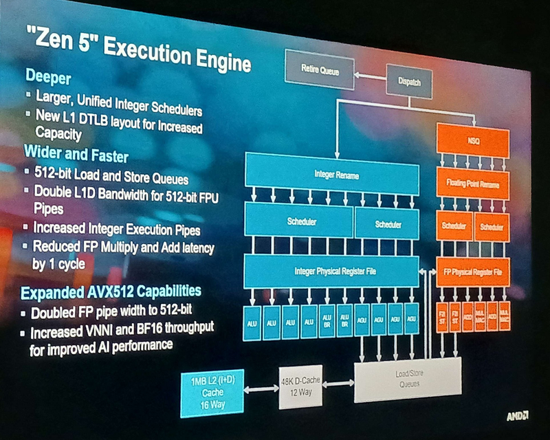 Però facciamo un passo indietro... perchè non sono un ingegnere. facendo un parallelismo automobilistico, sarebbe come se hai una strada a 2 corsie, negli orari di punta perderesti il 10% (come riporta AMD), ma creare un 3 corsie, non vorrebbe dire solamente di non perdere quel 10%, ma anche la possibilità di guadagnarci ulteriormente. Anche perchè le ALU cambiano... cioè non stiamo parlando di ALU Zen4, potenziare il fonte/end e quantificare il risultato con le stesse ALU Zen4. ma passiamo da ALU Zen4 a Zen5 con Front/end potenziato. Sarebbe come ok cambiare a 3 corsie la vecchia 2 corsie, ma poi abbiamo anche vetture che marciano a velocità superiori, set di istruzioni nuovi che permettono la stessa elaborazione con meno cicli di clock. Probabilmente AMD ha dovuto cambiare il front/end con Zen5 perchè la perdita sarebbe stata molto superiore al -10% di Zen4. Non ricordo con che CPU era... ma solamente allungando la pipeline MMX si aumentò l'elaborazione FP notevolmente.