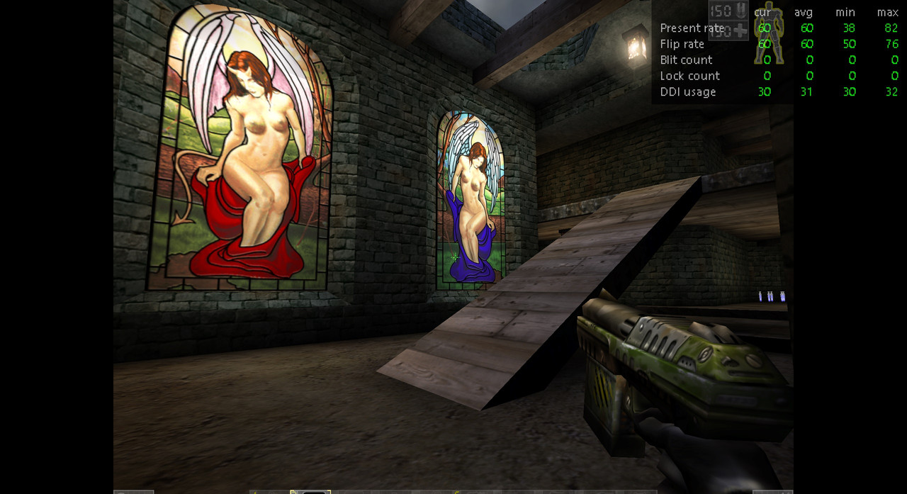 Questo invece è UT99 469d ( https://github.com/OldUnreal/UnrealT...ases/tag/v469d ) in DDRAW (!) con lo wrapper di Narzoul (DDRAW anni '90 -> DDRAW Win10/11) come potete vedere dal fatto che *MANCHI* l'overbright che ben si nota altrimenti sulle "vetrate" alla Angeli&Demoni