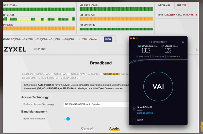 1Gbit a 800m, non chiaro se su Vodafone o Wind (lo speed test li mostra entrambi, non lo uso da una vita e non so come vada interpretato). C'è una cosa che vorrei capire bene! All'inizio dice che in Italia la nostra rete 5G è ancora in NSA e che quindi il router funziona in modo limitato.