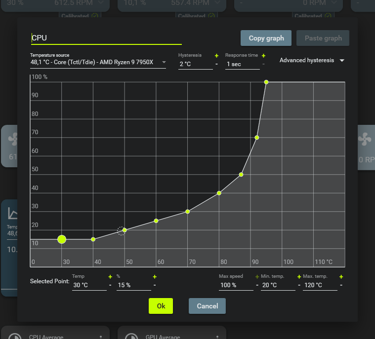 La temperatura in idle è sui 45 gradi, solo con il browser o carichi leggeri non si muove. Con cose più pesanti, compilazione in visual studio o esportazione foto non sale oltre gli 82 gradi con ventole sotto al 50%. Solo in Cinebench arriva a 95 Questa è la curva delle ventole: