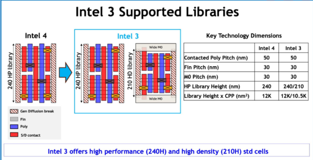 Intel 3 ha gli stessi valori (anzi un pelo inferiori), di un 5nm di TSMC. In realtà non è un vero e proprio nodo, ma una versione migliorata HP di intel4 (per CGP/CPP anch'esso è paragonabile ad un 5nm TSMC). Potremmo definire il PP in: Intel4 - TSMC 5nm (anche se è più scarso) Intel3- TSMC 5nmP Tuttavia, qualche differenza c'è, come la possibilità di utilizzare celle logiche da 210, contro le classiche 240 (ricordo che intel7 le ha da 408), connessioni riviste, quindi meno perdite etc. ![]() Tutte le modifiche ai layer e alla libreria HP, secondo intel dovrebbero dare una potenza ISO 0,65v del 15% rispetto a intel4, non solo, essendo per alte prestazioni, il PP è progettato per rendere meglio ad alte tensioni ulvt. La fregatura, è che l'ISO la trovi a clock appena sopra i 2ghz, ma se intel 4, scema salendo di res, è differente per intel3 (infatti uno viene utilizzato per mobile, l'altro è appositamente studiato per HETD). ![]() In sintesi, Intel3 è un 5nm TSMC, migliore solo di samsung 5/4nmLPP. Di tale PP, usciranno varie modifiche per adattarlo all'HEDT, ma può essere configurato anche per altro sostanzialmente. Purtroppo, anche questi nodi, restano impossibili da paragonare a raptor, in quanto tale PP, è si un 7nm, ma ha subito una serie importante di migliorie agendo sull'ulvt. Quote: