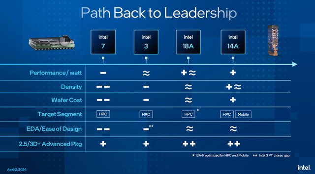 Per il resto loro possono farsi le faide che vogliono, ognuno porta acqua al proprio mulino, è fondamentalmente naturale. Al momento dai 7nm, non abbiamo visto competizione. Intel sbandiera PP, TSMC li produce, ma non abbiamo visto una comparazione applicata al progetto. Questa è una slide i aprile 2024, ben primi arrow: Intel20A non compare, ma Pat, ci scrive che intel3, potrebbe anche giocarsela con TSMC3nm cell (un bluff), ma è inferiore a tutto, essendo un 5nm. Il 18A, per Intel può competere con il 2nm TSCM (per lui, ovviamente). ![]() Quote: